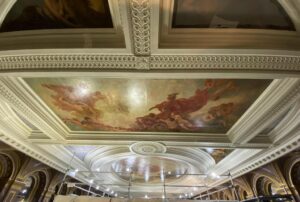 Following a preliminary condition appraisal in August 2018 and a further inspection and trials in August 2020, Hirst Conservation were commissioned to undertake conservation and restoration of the marouflaged canvas paintings to the decorative plaster ceiling of the Grade II* listed Drapers’ Livery Hall, Throgmorton Avenue, London.