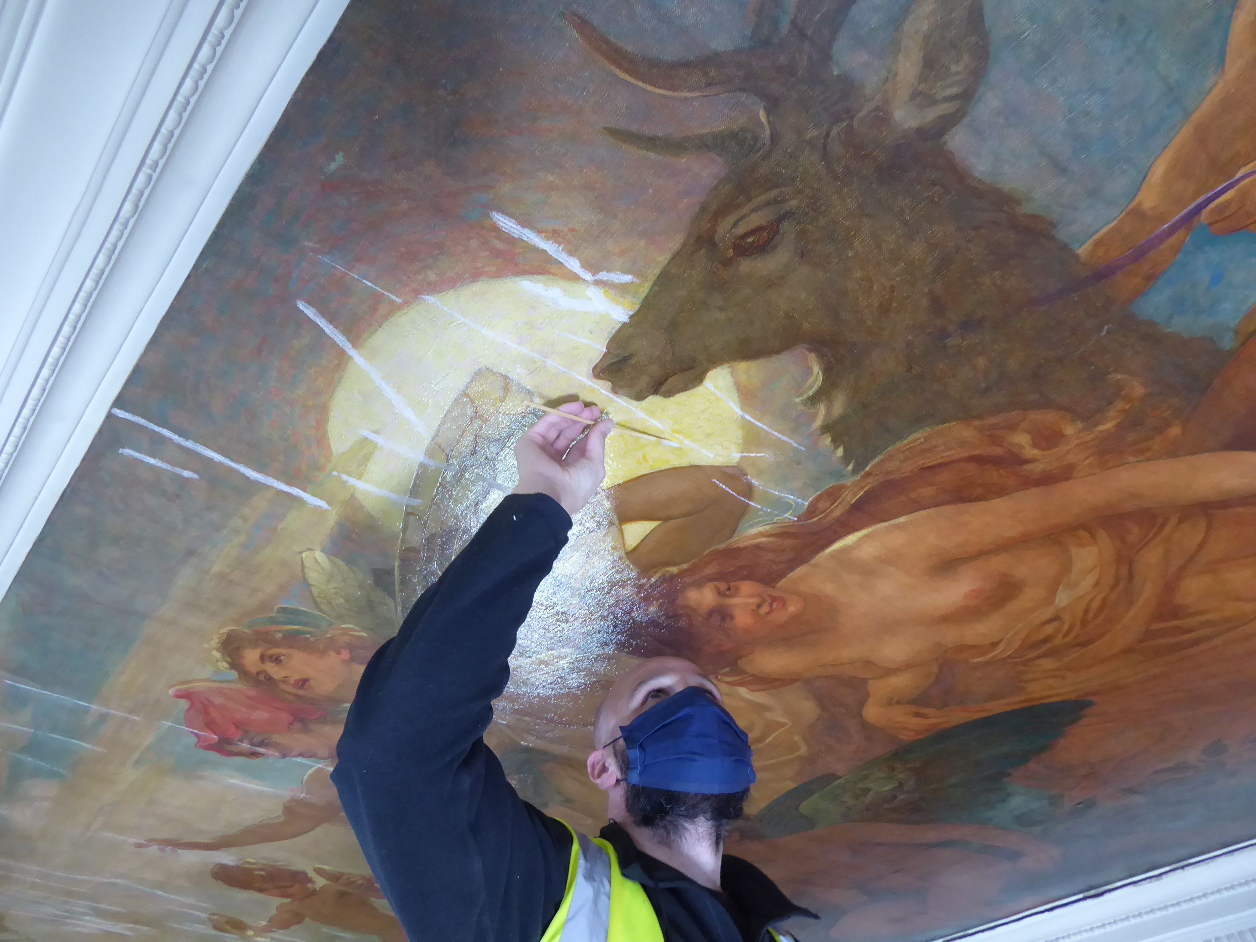 Conservation works were carried out in early 2021 following a full condition assessment including full photographic and diagrammatic recording, material trials and stabilisation of delaminated canvases and paint consolidation.